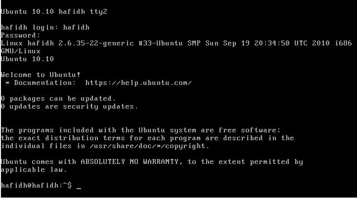 Pindah ke command line terminal (tty2) dengan menekan CTRL+Alt+F2 dan login ke terminal sebagai user.