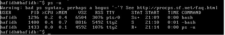 Mencari proses yang spesifik pemakai. Proses diatas hanya terbatas proses milik pemakai, dimana pemakai tersebut melakukan login $ ps -u<user>